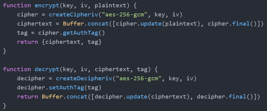 iv = input.slice(0, 12) auth = input.slice(12, 28) ciphertext = input.slice(28) plaintext = decrypt(key, iv, auth, ciphertext)