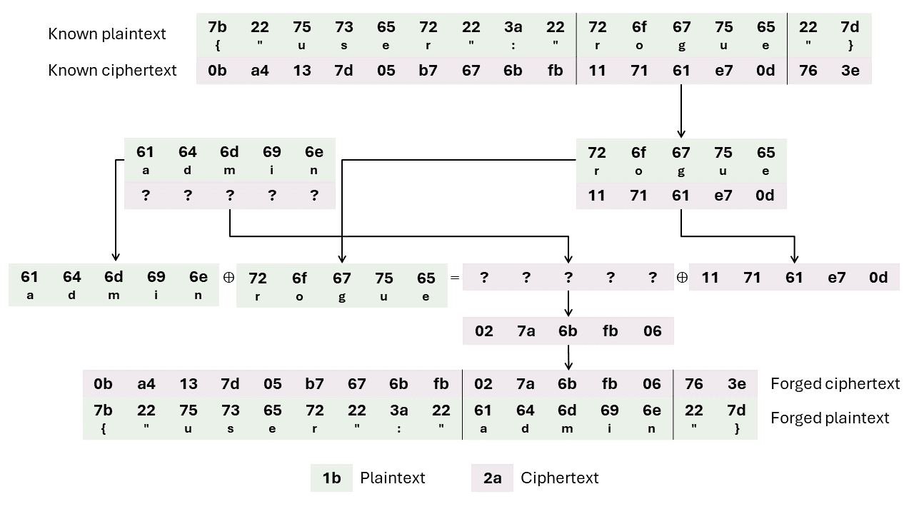 which returns {"user":"rogue"}. Assuming this is the structure that underlies the encryptedUser field, we can maul it surgically due to the Counter mode (CTR) underpinning GCM: